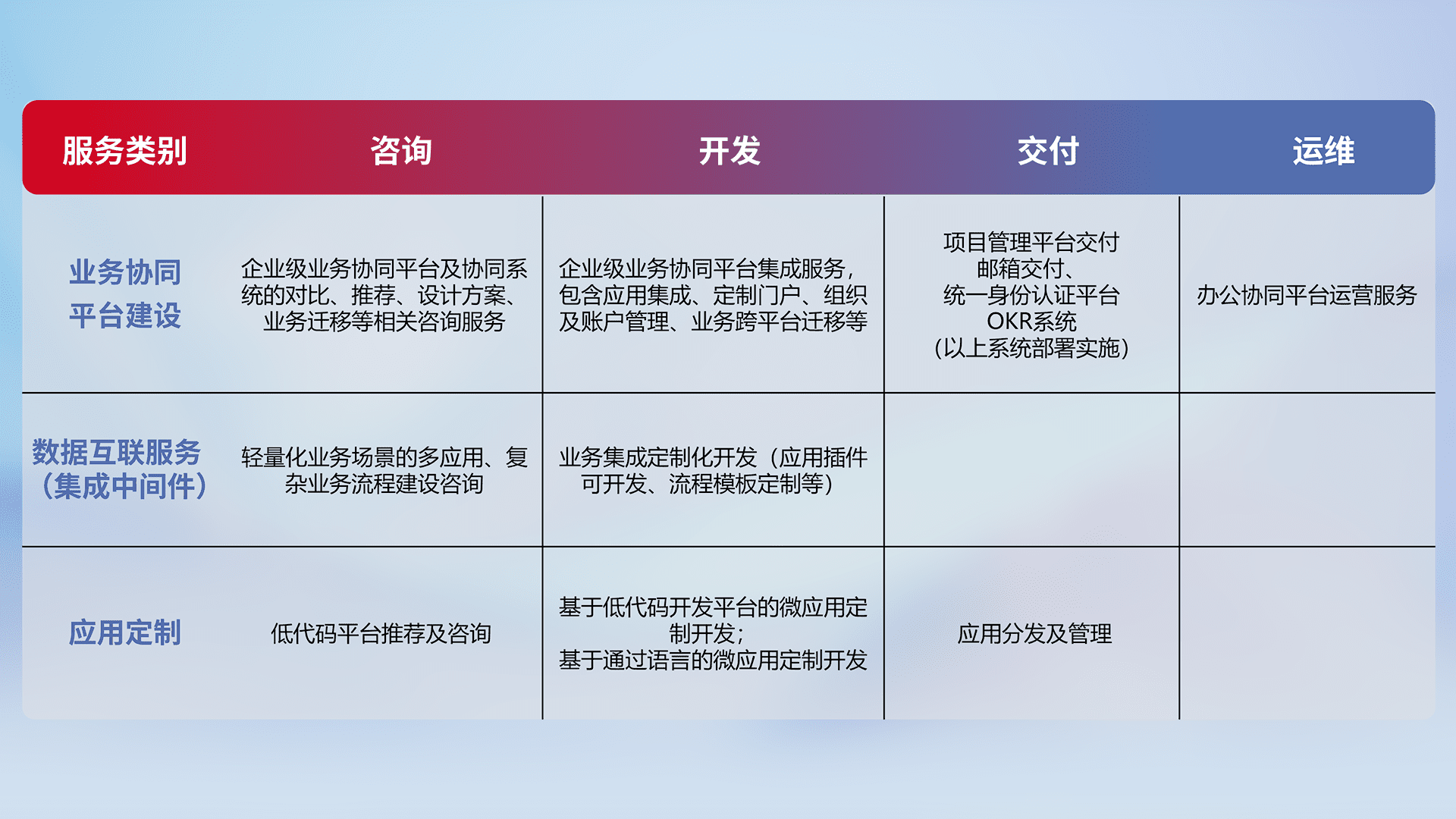 针对钉钉、、企微、、、、IDaas等平台级产品提供产品的规划、、方案、、、、交付、、、、定制化开发等服务,,,,实现如统一协同办公、、、、智能客户服务、、混合会议管理、、、智能数据查询、、、、等业务场景,,,实现数字化转型。。