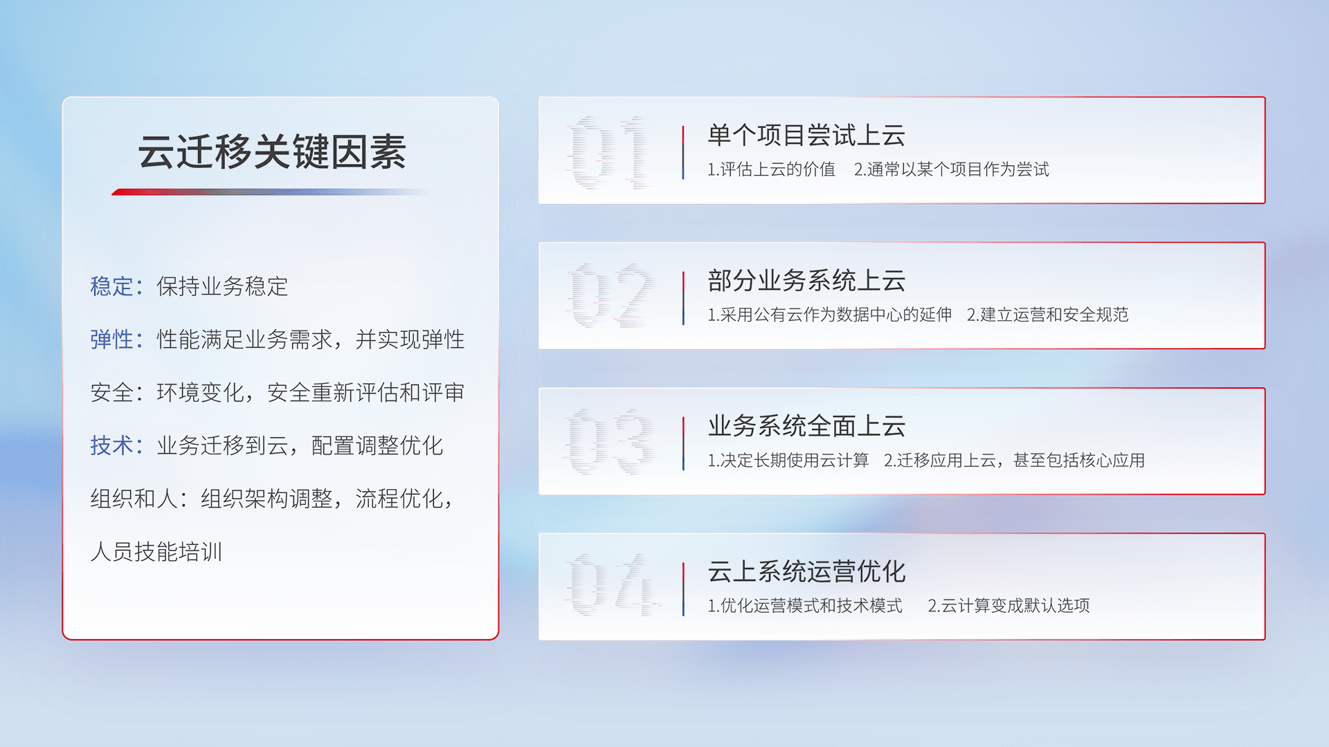 结合实际业务,,从规划设计、、、、云平台选型、、云原生改造、、数据迁移、、、集成交付,,,迁移全过程为客户识别最佳上云路径,,,做好风险识别管理,,,设计网络架构、、、身份权限、、安全审计合规、、、操作审计、、日志审计、、监控告警策略、、、多站点容灾设计等,,,,对云上基础设施进行整体规划,,提升IT治理水平,,,以满足弹性、、、、高可用、、高性能的需求。。。