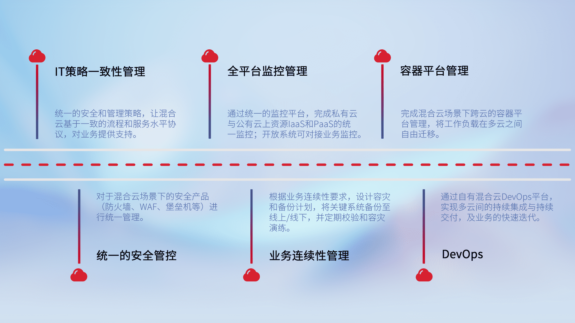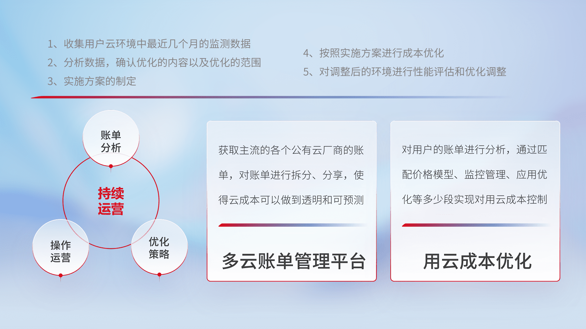 通过多云纳管,,以统一的资源数据模型把客户的云资源进行抽象和封装,,,,进而实现对多云资源的统一操作,,,保障云资源管理的可靠性、、、稳定性与可用性。。量身定制化运维内容,,配置、、开发运维、、补丁管理、、、、备份、、、、监控、、认证和访问管理、、、审计和日常巡检等,,,保障在用云过程中的可靠度,,,,稳定度以及高可用率。。。